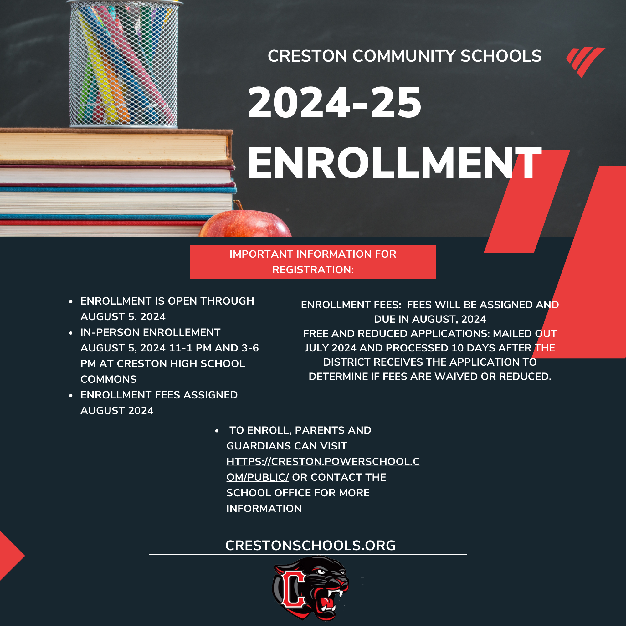 *Please note preschool enrollment is a different process. Please contact the Early Childhood Center administrative assistant, Lindsey Gordy, (lgordy@crestonschools.org) to enroll for preschool*
